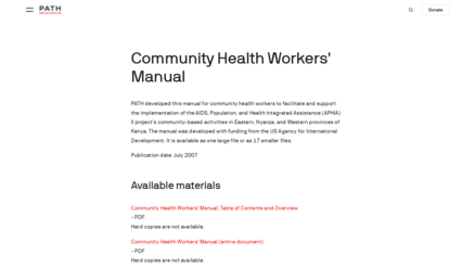 PATH developed this manual for community health workers to facilitate and support the implementation of the AIDS, Population, and Health Integrated Assistance (APHIA) II project’s community-based activities in Eastern, Nyanza, and Western provinces of Kenya. The manual was developed with funding from the US Agency for International Development. It is available as one large file or as 17 smaller files.