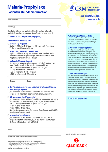 Malaria is a significant risk for travelers to endemic regions. This patient information highlights essential prevention through mosquito protection and, when indicated, chemoprophylaxis with Atovaquone/Proguanil, Doxycycline, or Mefloquine. Emergency self-treatment options may be carried in specific settings. Travelers are advised to follow medication schedules carefully, use consistent bite protection, and seek immediate medical care if fever occurs during or after travel. Early recognition and treatment are crucial to prevent severe or life-threatening complications.
