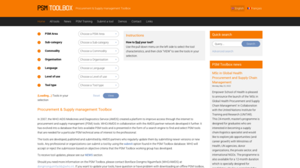 the WHO AIDS Medicines and Diagnostics Service (AMDS) created a platform to improve access through the internet to procurement and supply management (PSM) tools. WHO/AMDS in collaboration with the AMDS partner network developed it further. It has evolved into a database that lists available PSM tools and is presented in the form of a search engine to find and select PSM tools that are needed for a particular PSM technical area of interest to the professional.
