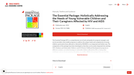 The Essential Package (EP) is a comprehensive set of tools and guides for program managers and service providers that enables programs to address the unique needs and competencies of young children, particularly those affected or infected by HIV/AIDS, in an integrated and holistic way. The components of the package have been developed so that they can be easily integrated into existing OVC (Orphans and Vulnerable Children ) and ECD (Early Childhood Development) programs in different contexts, currently focusing on vulnerable children affected by HIV, or facing other challenges such as chronic poverty, disruption, on conflict