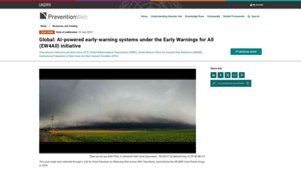 The webpage presents a case study on the use of artificial intelligence (AI) in global early warning systems as part of the United Nations’ “Early Warnings for All” (EW4All) initiative. The initiative aims to ensure that everyone worldwide is protected by effective early warning systems for natural hazards such as storms, floods, and other extreme weather events by 2027. The case study highlights how AI technologies are used to analyze large amounts of data from sources like satellites and weather models, improving forecasting accuracy and enabling faster, more targeted warnings to vulnerable populations. Overall, it focuses on leveraging advanced technology to strengthen disaster preparedness and risk reduction globally.