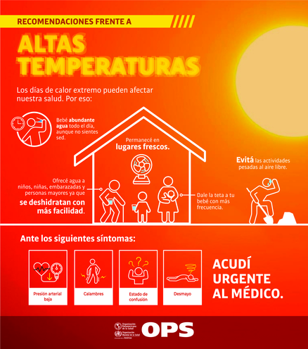 En esta sección vinculada al fenómeno climático de altas temperaturas se puede acceder a las principales recomendaciones sobre: medidas de cuidado y golpe de calor.