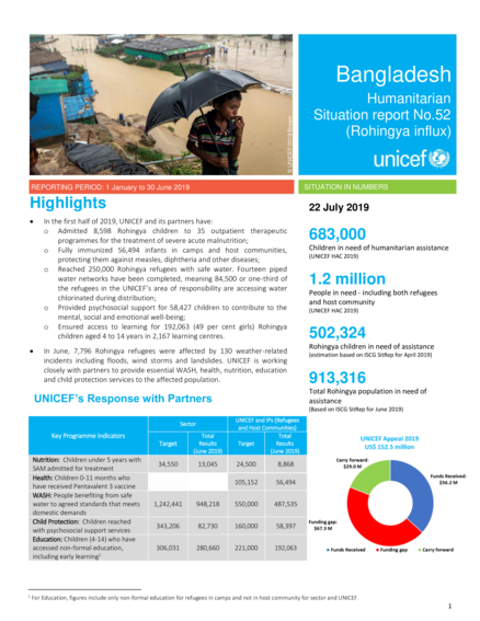 o Admitted 8,598 Rohingya children to 35 outpatient therapeutic programmes for the treatment of severe acute malnutrition; o Fully immunized 56,494 infants in camps and host communities, protecting them against measles, diphtheria and other diseases;