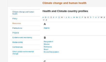 WHO UNFCCC Climate and health country profiles Monitoring health impacts of climate change and progress in building climate resilient health systems.