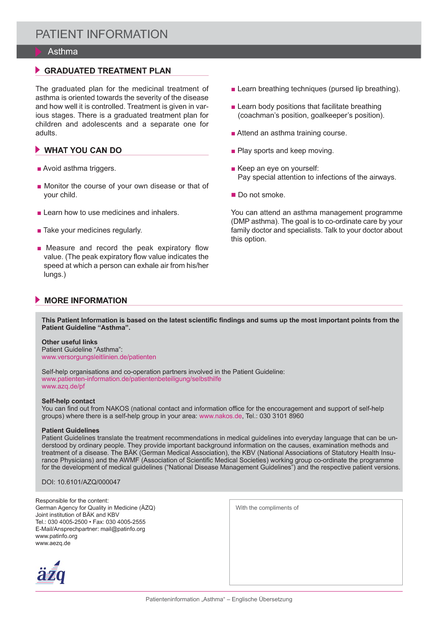 Patient information on Asthma. English version. Also available in: Arabic, French, German, Russian, Turkish, Spanish. For other versions go to: http://www.patienten-information.de/kurzinformationen/lunge/asthma