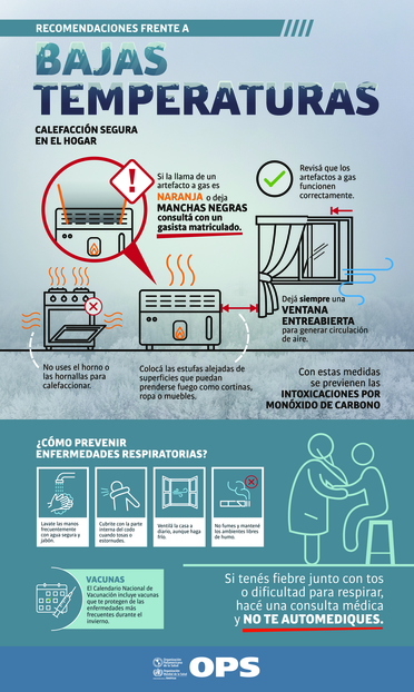 En esta sección vinculada al fenómeno climático de bajas temperaturas se puede acceder a las principales recomendaciones sobre: intoxicación por monóxido de carbono; calefacción segura en el hogar; cómo prevenir enfermedades respiratorias; vacunas.