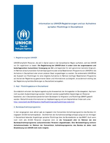 Information zu UNHCR-Registrierungen und zur Aufnahme syrischer Flüchtlinge in Deutschland