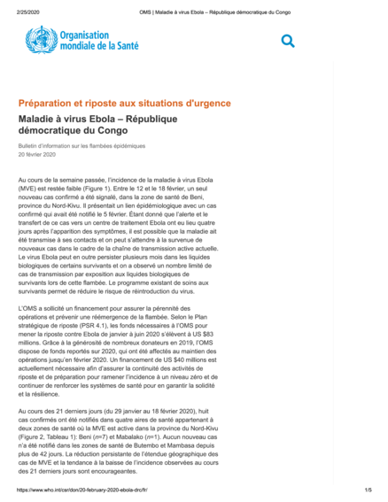 Maladie à virus Ebola – République démocratique du Congo: Bulletin d’information sur les flambées épidémiques 20 Février 2020