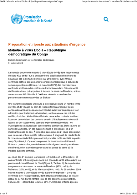 Maladie à virus Ebola – République démocratique du Congo Bulletin d’information sur les flambées épidémiques, 31 octobre 2019