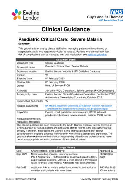 This guideline is for use by clinical staff when managing patients with confirmed or suspected malaria who require admission to hospital.