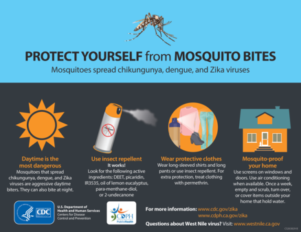 The poster is a public health communication tool designed to prevent the transmission of diseases such as chikungunya, dengue and Zika. The poster emphasises that Aedes mosquitoes bite aggressively during the day and sometimes at night, and recommends the key prevention strategies.