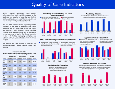 This fact sheet summarizes the key quality of care indicators in the areas of antenatal care, family planning, and sick child care, across the recent SPA surveys in Haiti, Senegal, Kenya, Namibia, Rwanda, and Uganda. Data can be compared across countries or, as in the Kenya example, by type of facility, managing authority, and subnational region, as well as over time for trend analysis.
