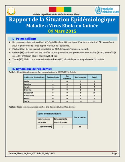Rapport de la Situation Epidémiologique Maladie à Virus Ebola en Guinée, 9 mars 2015