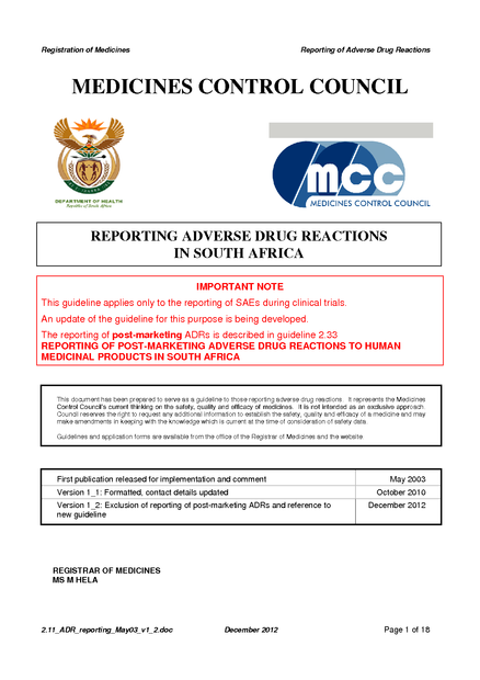 IMPORTANT NOTE: This guideline applies only to the reporting of SAEs during clinical trials. An update of the guideline for this purpose is being developed. The reporting of post-marketing ADRs is described in guideline 2.33 REPORTING OF POST-MARKETING ADVERSE DRUG REACTIONS TO HUMAN MEDICINAL PRODUCTS IN SOUTH AFRICA