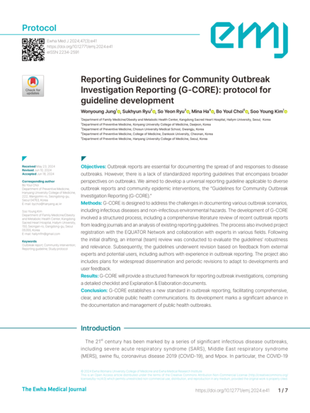 The article “Reporting Guidelines for Community Outbreak Investigation (G-CORE): A Study Protocol” describes the development of standardized reporting guidelines for investigations of infectious disease outbreaks in community settings. The authors highlight that outbreak reports are often inconsistent and lack important epidemiological information, which makes it difficult to compare studies and apply findings to public health practice. The G-CORE project aims to create a structured guideline that improves the quality, transparency, and completeness of outbreak investigation reports. By establishing clear reporting standards, the guideline intends to support researchers and public health professionals in documenting outbreaks more systematically and to facilitate better communication, analysis, and response to infectious disease events.