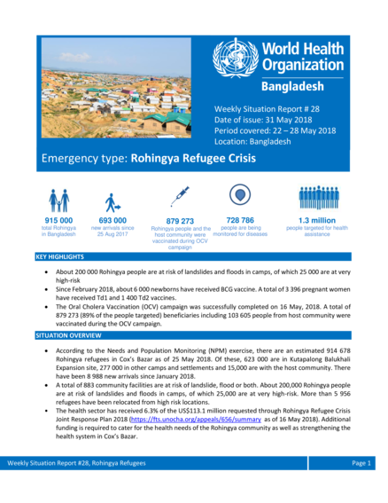 Rohingya Refugee Crisis - WHO Bangladesh Weekly Situation Report #28, 31 May 2018