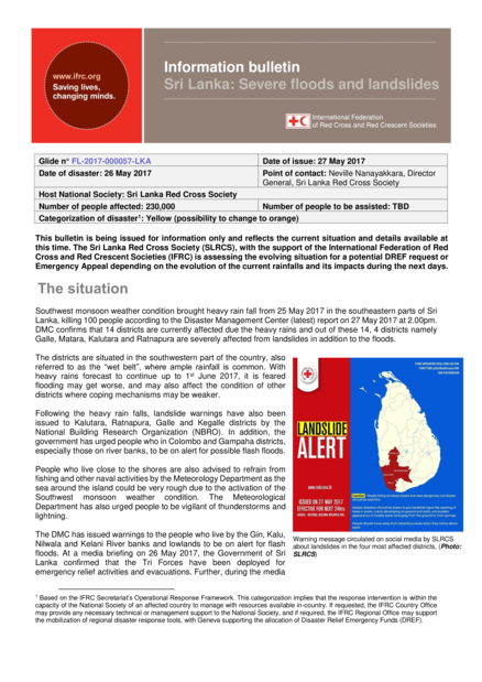 This bulletin is being issued for information only and reflects the current situation and details available at this time. The Sri Lanka Red Cross Society (SLRCS), with the support of the International Federation of Red Cross and Red Crescent Societies (IFRC) is assessing the evolving situation for a potential DREF request or Emergency Appeal depending on the evolution of the current rainfalls and its impacts during the next days.
