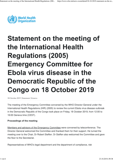 Statement on the meeting of the International Health Regulations (2005) Emergency Committee for Ebola virus disease in the Democratic Republic of the Congo on 18 October 2019
