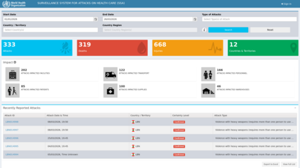 The Surveillance System for Attacks on Health Care (SSA) is a global monitoring platform run by the World Health Organization that systematically collects and displays standardized data on attacks against health care in settings affected by conflict or humanitarian emergencies. It records incidents where health workers, facilities, transport, patients, or other health resources are harmed, obstructed, threatened, or subjected to violence, with the goal of documenting the nature and scale of these attacks worldwide. The system is used to analyse trends, support advocacy to protect health services and workers, and guide efforts to reduce violence against health care in fragile and conflict-affected contexts.