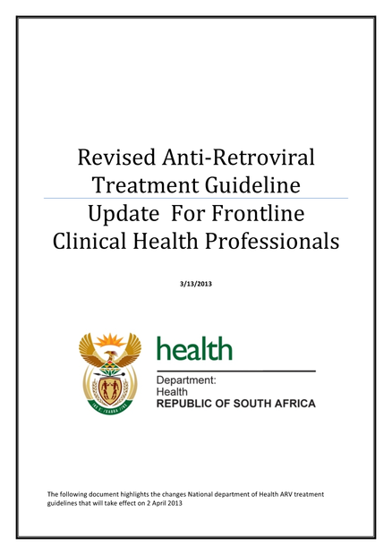 Includes the departments standardised guidelines for implementation of Fixed Dose Combination (FDC) regimens. Thus its purpose is to update frontline clinical staff for the implementation of FDC guidelines in PMTCT, paediatric and adult ARV treatment.