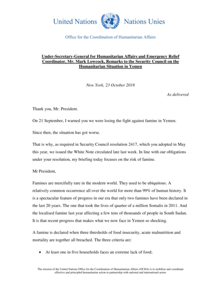 Under-Secretary-General for Humanitarian Affairs and Emergency Relief Coordinator, Mr. Mark Lowcock, Remarks to the Security Council on the Humanitarian Situation in Yemen