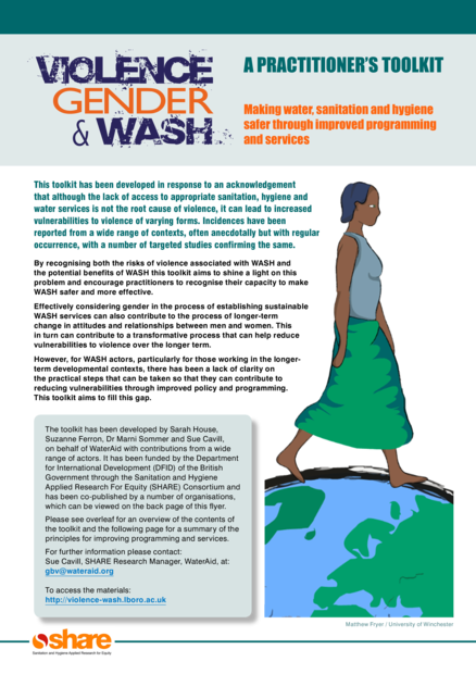 Making water, sanitation and hygiene safer through improved programming and services. This toolkit has been developed in response to an acknowledgement that although the lack of access to appropriate water, sanitation and hygiene services (WASH) is not the root cause of violence, it can lead to increased vulnerabilities to violence of varying forms. Incidences have been reported from a wide range of contexts, often anecdotally but with regular occurrence, with a number of targeted studies confirming the same. Please download the toolkit materials from the website: http://violence-wash.lboro.ac.uk/toolkit/