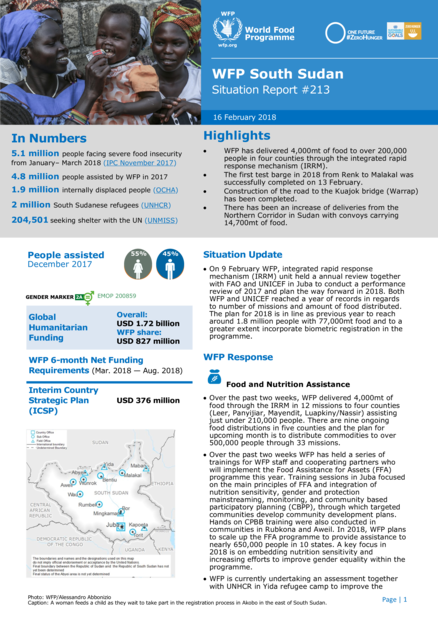 WFP South Sudan Situation Report #213 (16 February 2018)