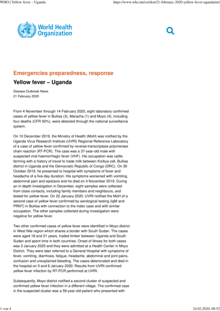 Yellow fever – Uganda Disease Outbreak News 21 February 2020