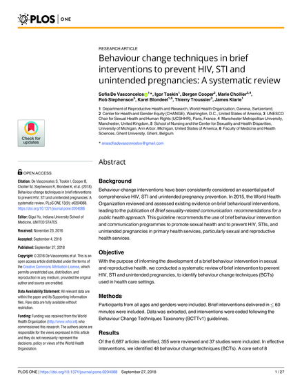PLoS ONE 13(9): e0204088. .https://doi.org/10.1371/journal.pone.0204088. Behaviour-change interventions have been consistently considered an essential part of comprehensive HIV, STI and unintended pregnancy prevention. In 2015, the World Health Organization reviewed and assessed existing evidence on brief behavioural interventions, leading to the publication of Brief sexuality-related communication: recommendations for a public health approach. This guideline recommends the use of brief behaviour intervention and communication programmes to promote sexual health and to prevent HIV, STIs, and unintended pregnancies in primary health services, particularly sexual and reproductive health services.