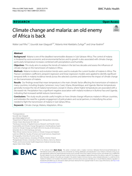 BMC Public Health (2025) 25:3774 https://doi.org/10.1186/s12889-025-24555-6. The study results provide useful insights on how climate change influences malaria in African countries, and reiterates the need for a greater engagement of policymakers and social partners, in intensifying the action needed to fight the transmission of malaria in Sub-Sahara Africa