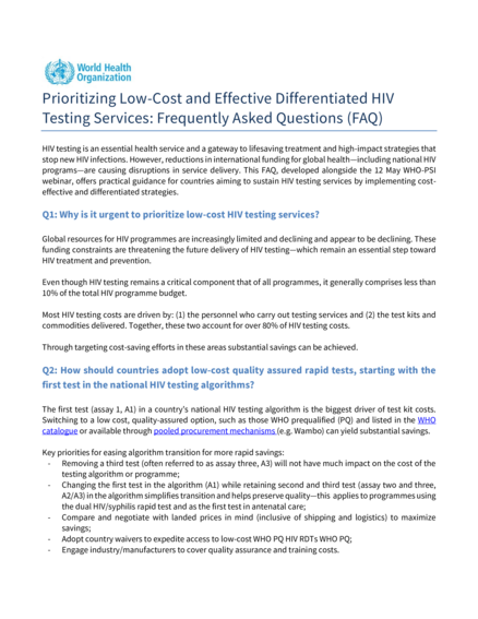 stop new HIV infections. However, reductions in international funding for global health—including national HIV programs—are causing disruptions in service delivery. This FAQ, developed alongside the 12 May WHO-PSI webinar, offers practical guidance for countries aiming to sustain HIV testing services by implementing cost-effective and differentiated strategies.